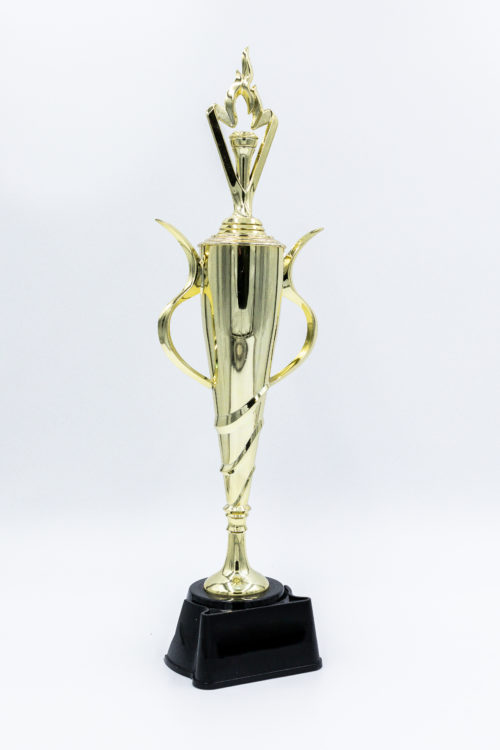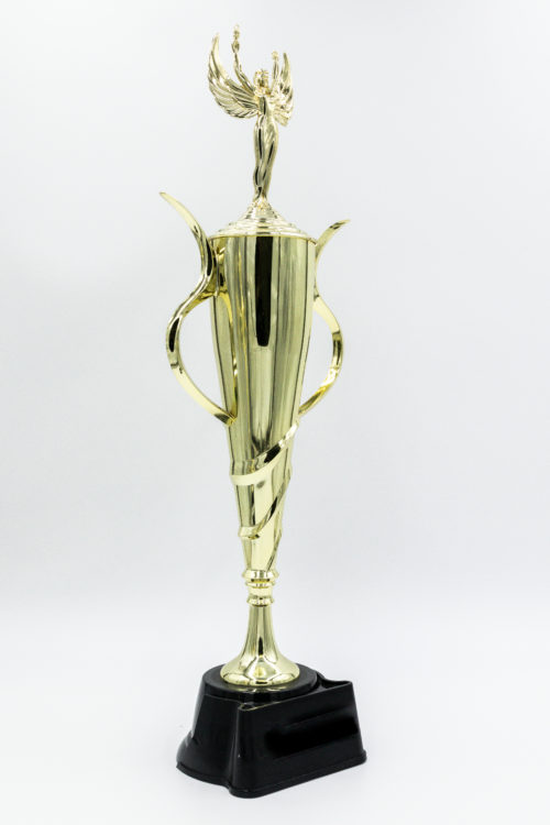 CP608A GOLD CUP WITH FIGURE ON BLACK BASE 17.75″