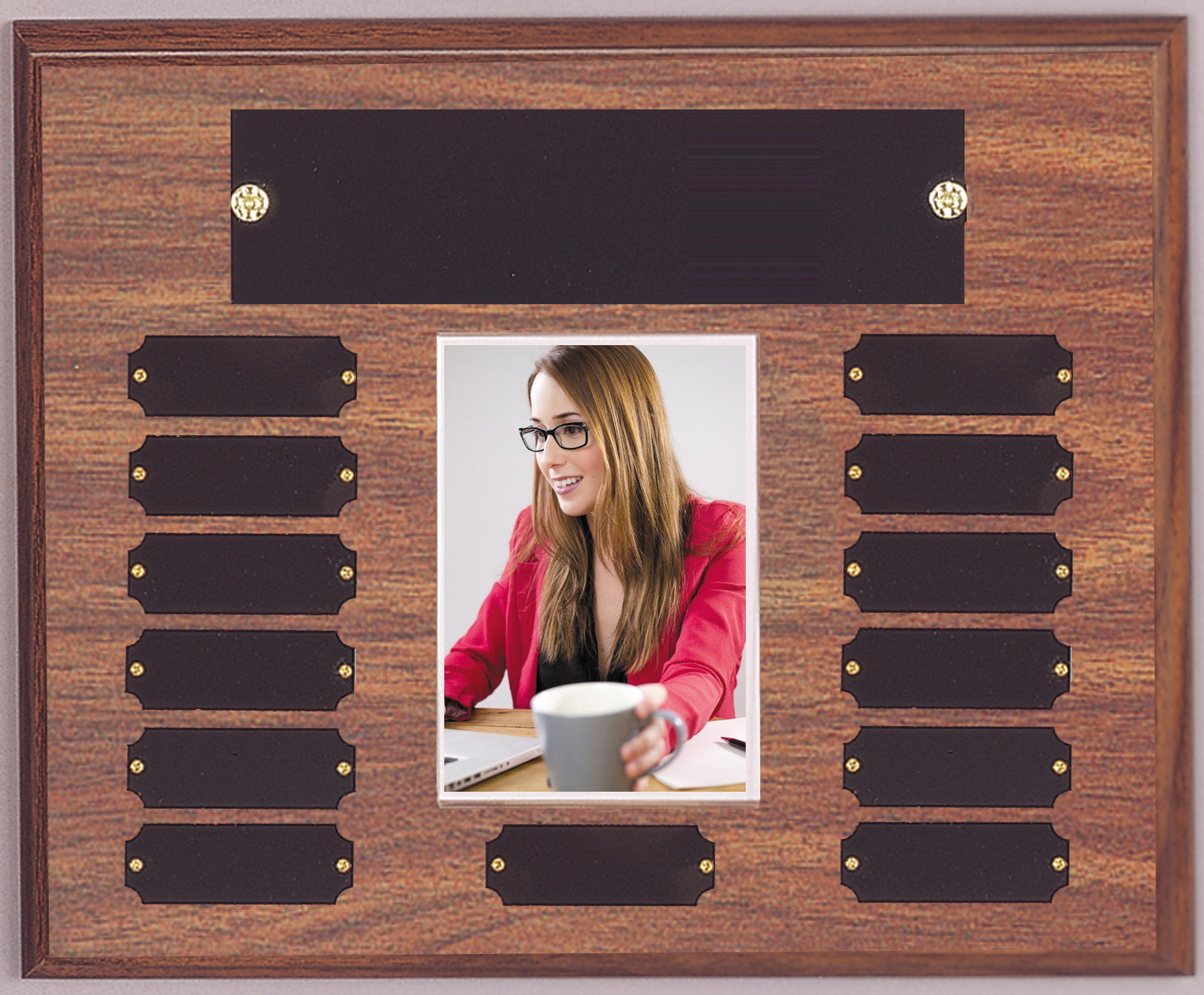 P1093 PERPETUAL PLAQUE WALNUT FINISH BLACK HEADER AND 13 ENGRAVING PLATES INDIVIDUALLY BOXED HORIZONTAL LAYOUT BARHILL 10 1/2″ X 13″. Price includes header plate. It does not include individual small plate, which would be at additional price.