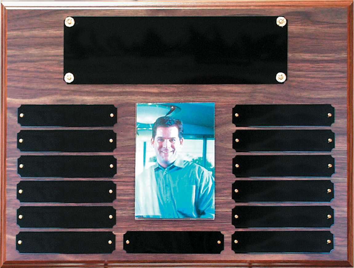 P1063 PERPETUAL PLAQUE WALNUT FINISH BLACK HEADER AND 12 ENGRAVING PLATES INDIVIDUALLY BOXED HORIZONTAL LAYOUT BARHILL 12″ X 16″. Price includes header plate. It does not include individual small plate, which would be at additional price.